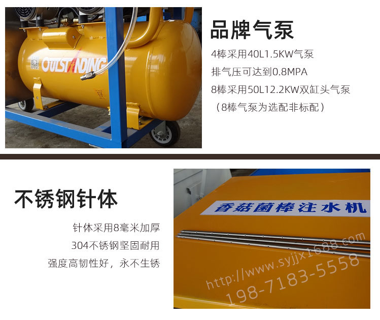 香菇菌棒注水機機型特點 :可回收水,對供水壓力和水源無特殊要求,注水量可根據(jù)客戶技術(shù)要求,定時定量隨用隨調(diào),全新雙頭8棒循環(huán)注水模式,注水效率提高一倍,四面防濺防漏水,水回收利用率達到90%以上,高比例的循環(huán)回收水功能可有效節(jié)約用水,降低棚內(nèi)排濕難度,避免爛棒,可以在水源中按比例加入營養(yǎng)素有效提高香菇品質(zhì)和產(chǎn)量。